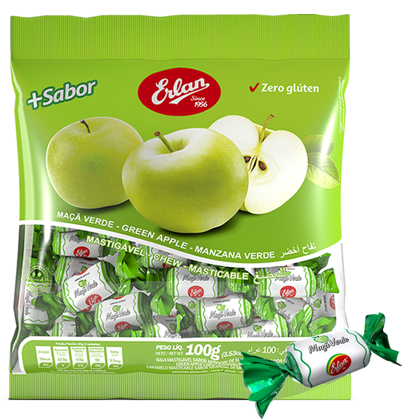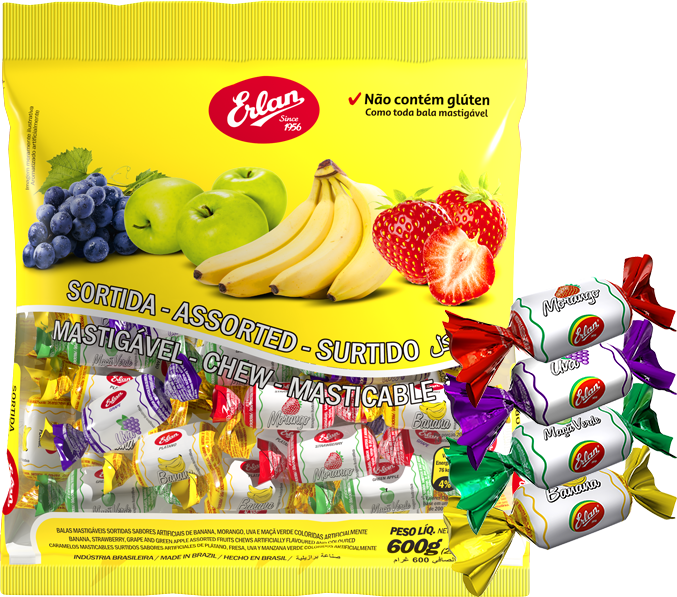 Bala Mastigável ErlanErlan, Produtos Maça verde 100g Morango 400g Framboesa 600g Gut 100g Mentinha 600g Sortida 600g Sortido 600g Toffee leite 100g